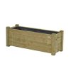 Stevige bloembak met duurzame pen- en gatverbindingen in de hoeken, waardoor de bloembak buitengewoon stevig is. Gemaakt van Noord-Europees naaldhout en voorzien van FSC®-keurmerk. Alle onderdelen zijn onder druk, met KOMO-keur, geïmpregneerd. De bloembak wordt volledig gemonteerd geleverd, inclusief waterdoorlatende bodem en anti-worteldoek. Er is optioneel een bijpassend rek verkrijgbaar, waarmee het geheel bijvoorbeeld kan dienen als effectieve terrasafscheiding.