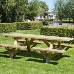 De ruime tussenruimte bij de zittingen van deze picknicktafel maakt een gemakkelijke instap mogelijk, zonder over de zittingen te hoeven stappen. Door de dubbele schroefverbinding aan de onderzijde en de stevige constructie biedt deze picknicktafel duurzaamheid voor jarenlang gebruik. Het hout is zorgvuldig geschaafd en geschuurd voor een optimale gebruikservaring. De picknicktafel is bovendien voorzien van een parasolopening. Vervaardigd van Noord-Europees vurenhout met FSC®-keurmerk. Volledig gemonteerd geleverd, montage is dus overbodig.